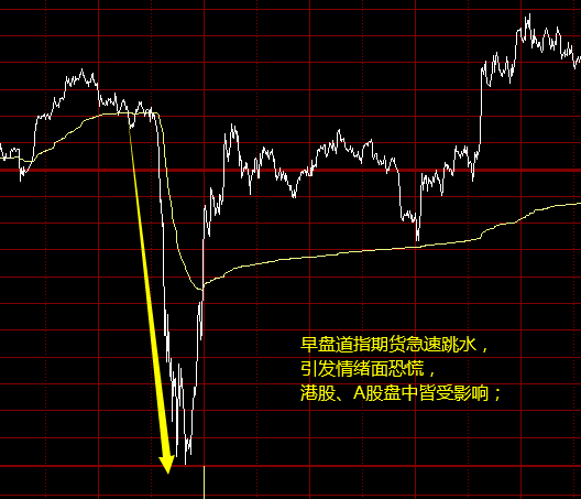 早盘的小幅清洗下跌,主要原因是受外围股市影响,早盘美道指期货突然跳水,从0.30%急跌到-1.6%,而港股方面也跟风回撤-1.21%,