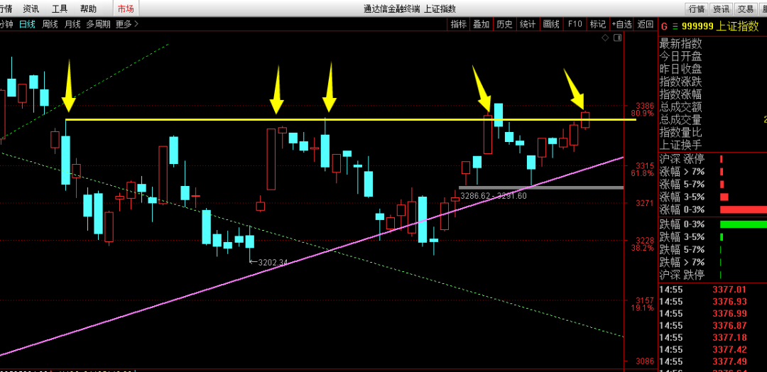 从日线的细化来看,上证,这里又再次回到了9月初从顶部开始下跌调整震荡以来的再一次冲高箱体的顶端。