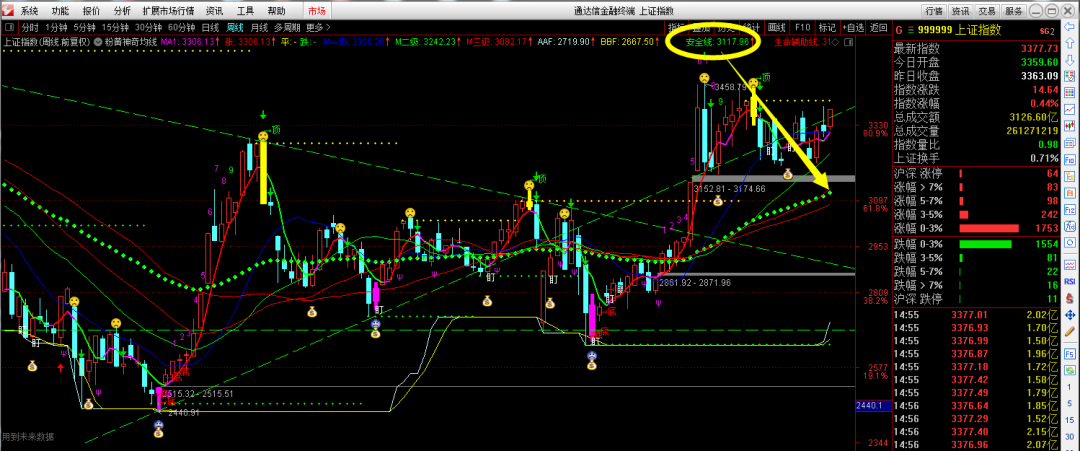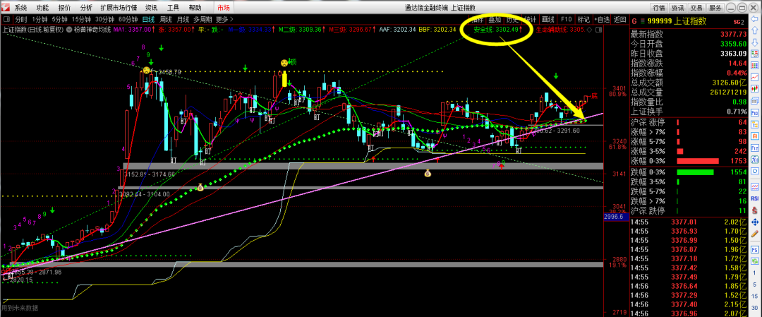 例行图,主要是根据不同周期,提供日、周、月等周期的定制系统图,重点关注系统中安全线的位置,安全线之上表明市场为强势(参与度高),安全线之下表明市场为弱势(参与度弱),可以根据安全线的位置来判断市场强弱并据此来制定操作计划。