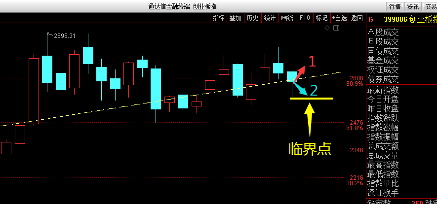 上周预测中,重点也是让盯着创业板的趋势线的得失,本周虽然大跌,但最后两天是反弹的,周五收盘是2667点。