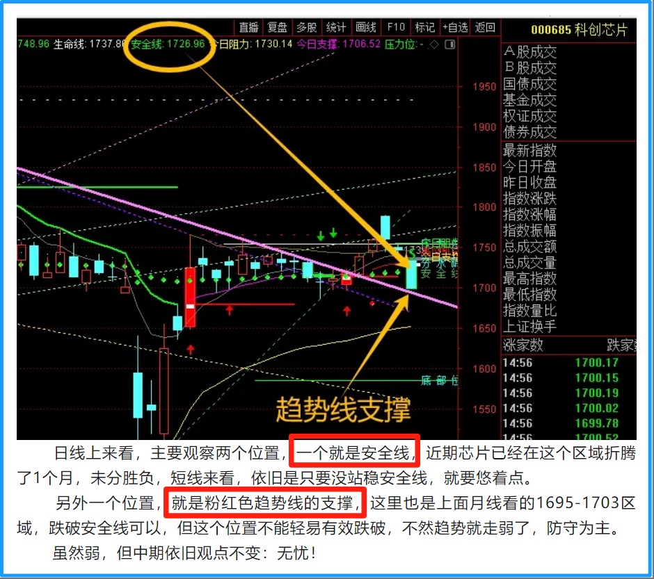 周末说到,芯片当下主要是观察两个位置,一个是安全线,另一个是趋势线,特别是安全线,没有彻底站稳之前,没戏,更多的是折腾,跌破趋势线的话,短线还需要控制一下仓位。