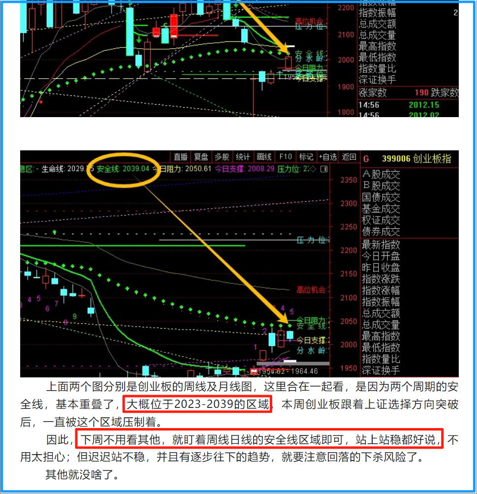 周末提到,创业板日线和周线的安全线基本处在一个小区域内,构筑了对创业板的压制,本周重点就看安全线区域能否站稳或者是形成压制。