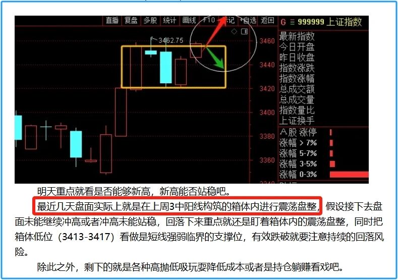 昨天说了,盘面这几天就是在上周三中阳线构筑的箱体内震荡折腾,今天没有新高,回落也不多,依旧是在箱体震荡的走法。