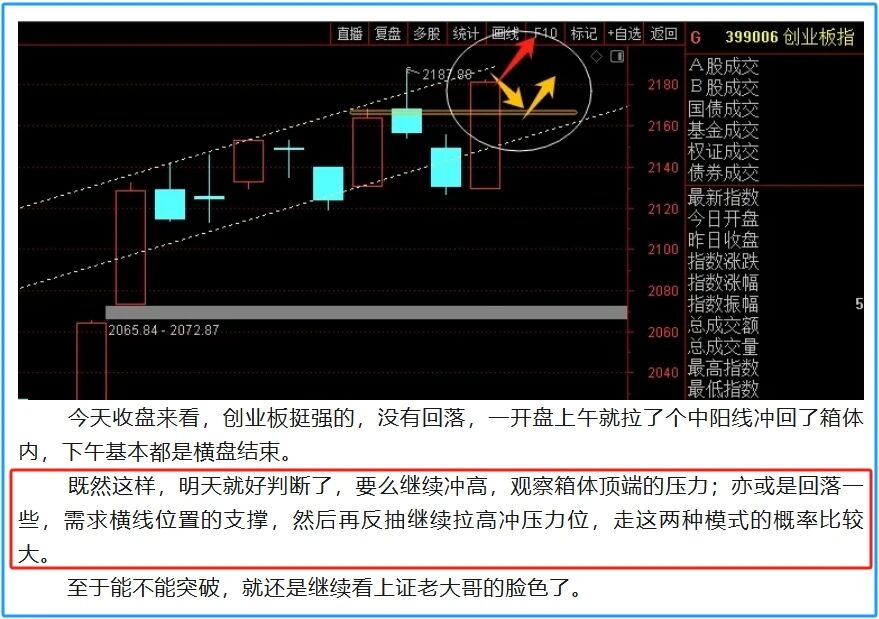 今天收长上影,明儿的盘面,创业板可以按照非上即下的走法来应对:冲高就看今天箱体是否能再次突破,关键看量能的持续;如果先回落,就先看昨天给的横线位置支撑的情况再具体考虑吧,不着急。