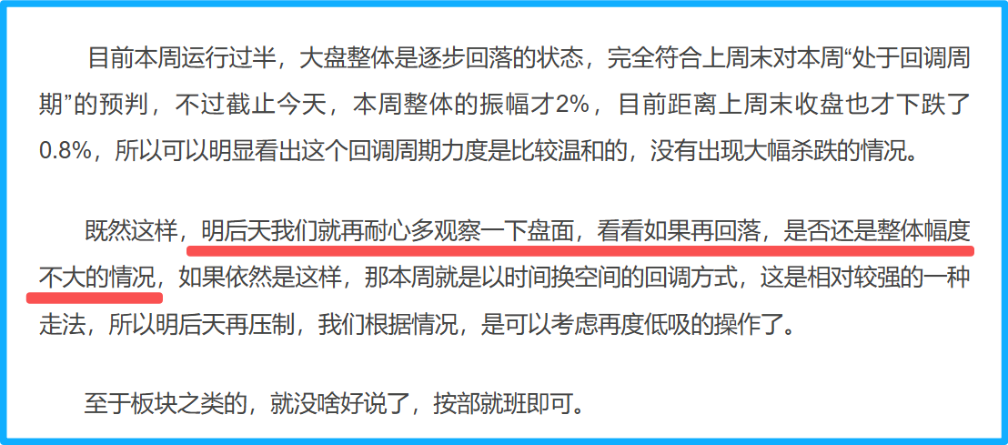 本周大盘处于回落周期,明天周五,这个回落周期走得七七八八了,所以明天是一个相对重要的节点,我们重点就看这个节点能否构筑一个短期的低位。