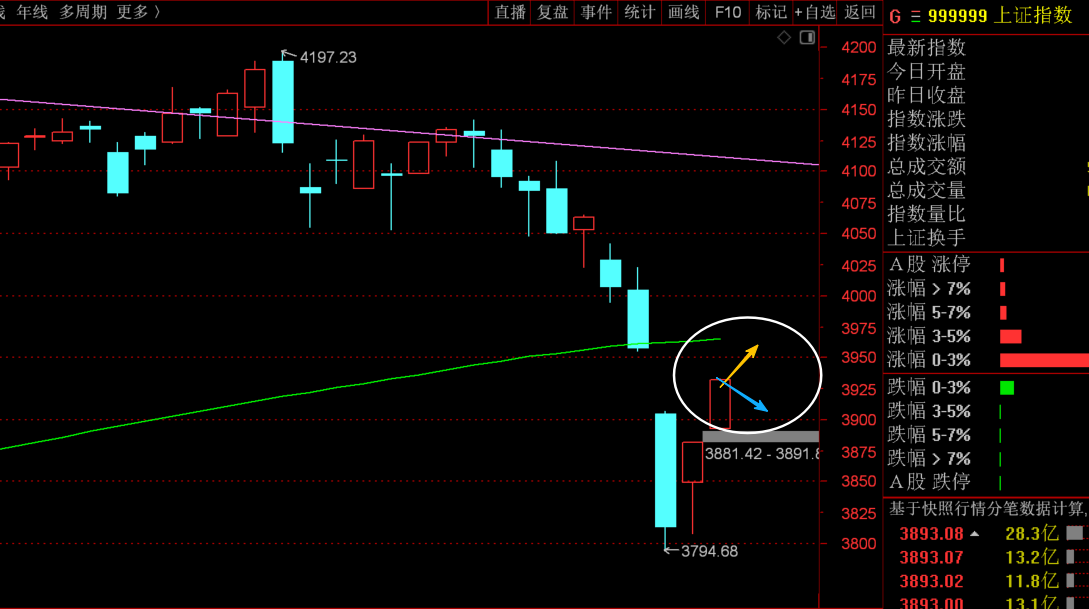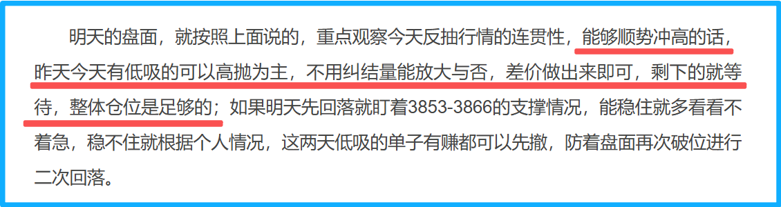 昨天说到,盘面反抽比预判中要强,今天继续反抽,就看周末给的3898-3904支撑位,这里跌破后形成了压力,需要重点关注,能到就可以把前两天低吸抄底的高抛止盈,不用纠结量能。