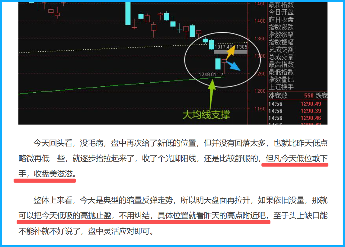 反过来,如果明儿盘面不能再拉高,也是正常的,那也要把抄底的仓位走掉,无所谓能否卖在高点,只要差价做成,盈利落袋即可,重要的是子弹再次归仓,为下一次做好准备。